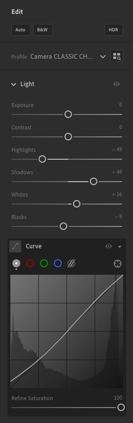 Whites og blacks er finjusteret for at give en smule mere liv i de lyse partier (+16) og en dæmpning i de mørke (-9). Resultatet er en billedkarakter, der minder om film, hvor kontrasten sjældent var helt så hård som i digital fotografering. Kurveværktøjet understøtter denne tilgang. Ved at løfte black point en smule reduceres kontrasten i de mørkeste områder. Dette skaber en mere mat og filmisk følelse.