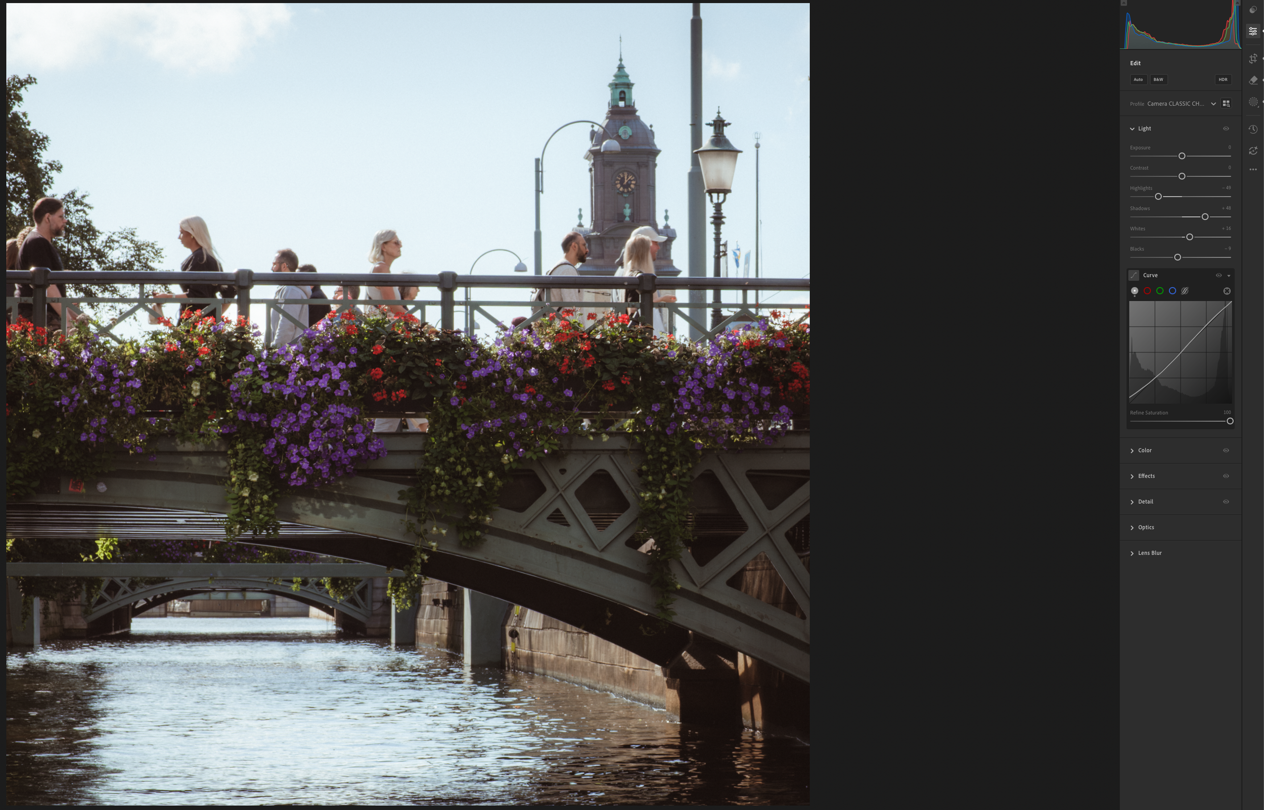 I det viste eksempel fra Göteborg er udgangspunktet Fujifilms Classic Chrome-profil. Dette er en filmsimulation, der allerede i kameraet giver dæmpede farver og et dokumentarisk udtryk. Fujifilm er kendt for deres film simulation-profiler, som findes direkte i kameraerne og også kan tilgås i Lightroom. Det er en oplagt mulighed for fotografer, der ønsker et look med karakter uden at starte helt fra bunden. Også fotografer med andre kameramærker kan efterligne dette udtryk i Lightroom ved at arbejde med lys, farver og effekter.